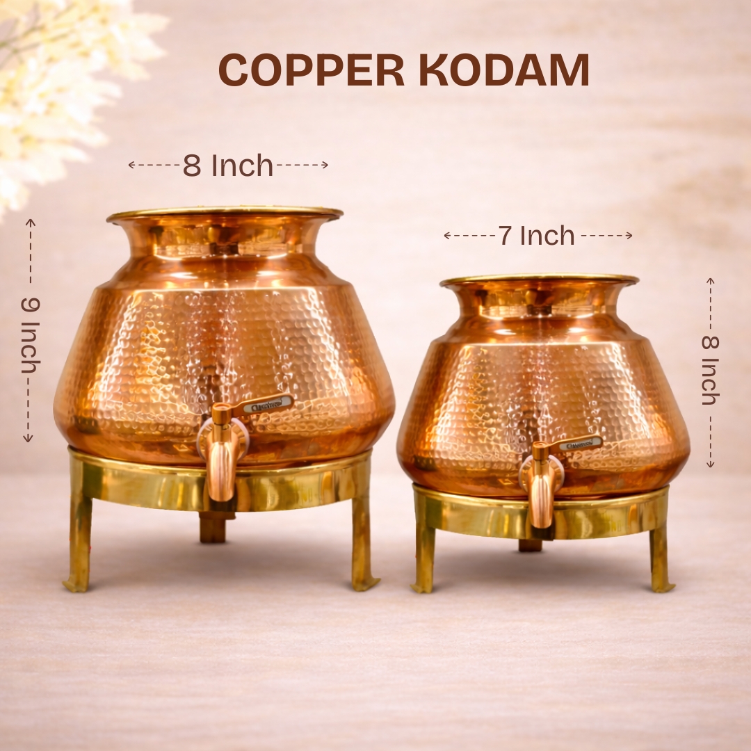 This traditional copper kodam is designed for safe and hygienic water storage, combining functionality with a classic look. Available in two sizes, it includes a tap opening option for easy and convenient water dispensing.